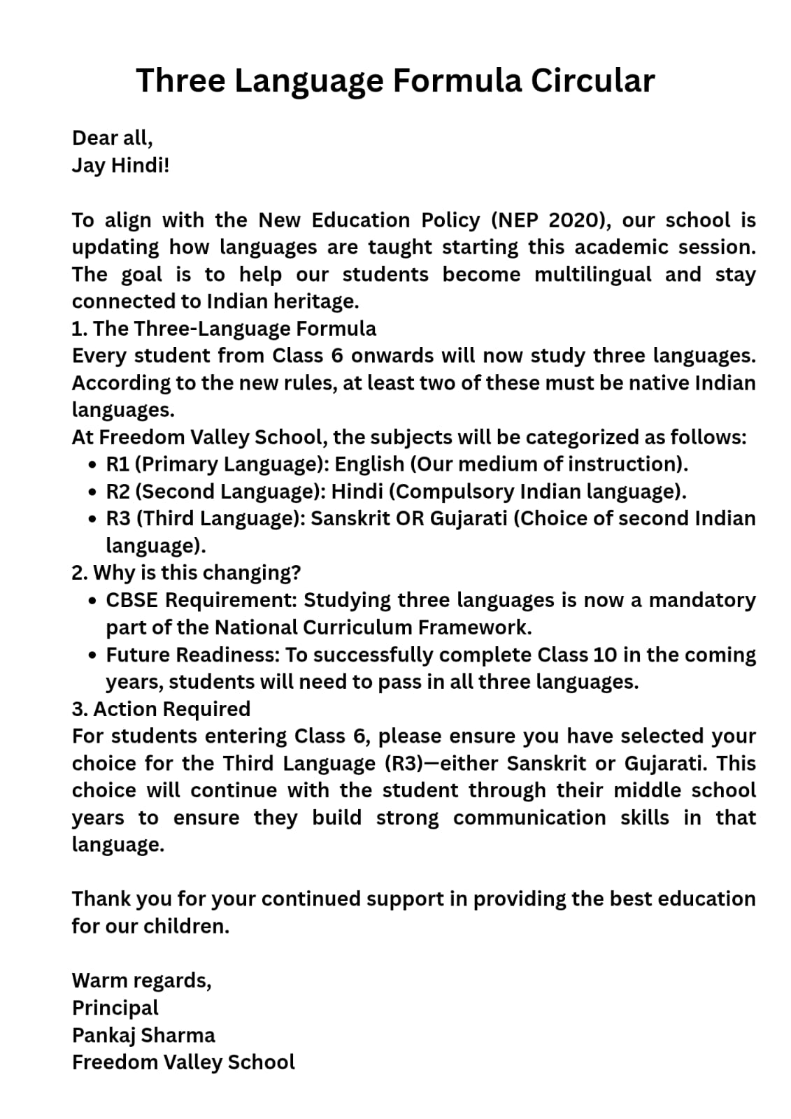 Freedom Valley School is implementing NEP 2020 & NCF2023 & the three language formula. Please read the circular.
