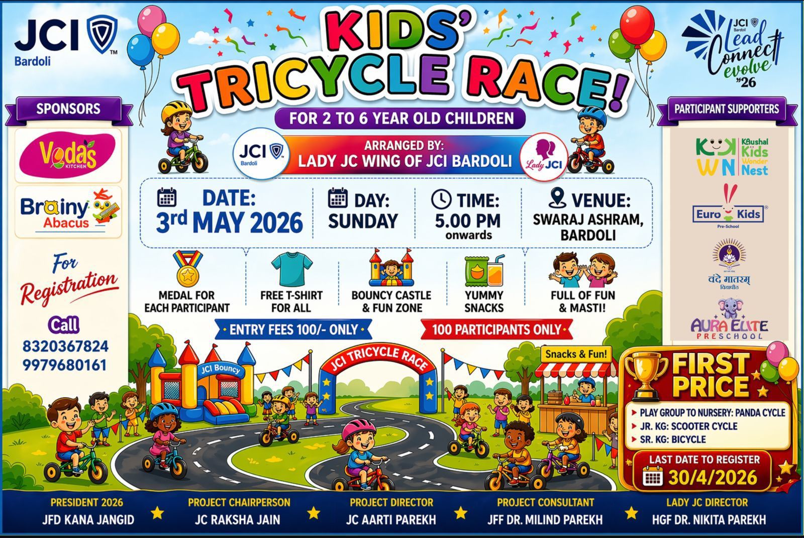 Kindly note there is an exciting Tricycle race been organised by JCI Bardoli.So, if you are interested for the same then please register by contacting the given ph numberin the pic attached.